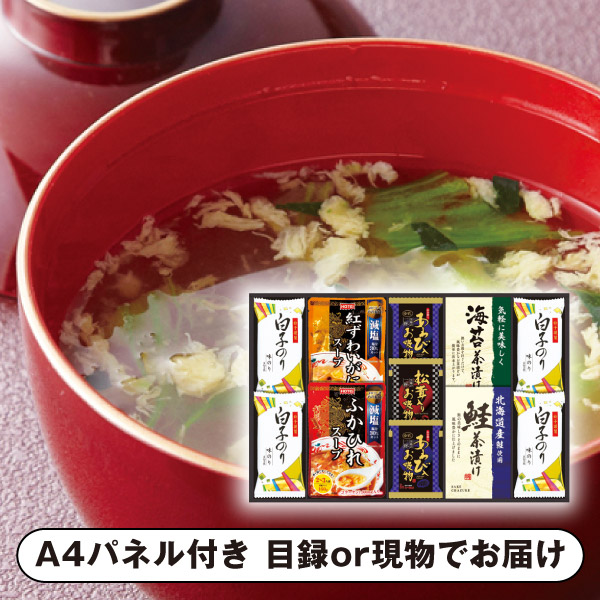 | 内容 | ふかひれスープ160g・紅ずわいがにスープ160g・松茸入りお吸い物4.2g・北海道産鮭茶漬け(4g×2)・丸美屋のり茶漬け(6g×2)×各1、あわび入お吸い物4g×2、白子のり(8切5枚)×4 A4パネル×1 |