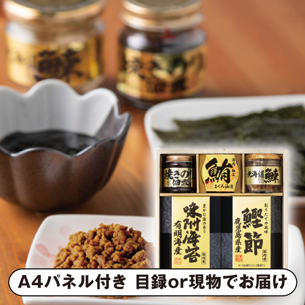 | 内容 | 北海道産鰊フレーク50g・焼きのり佃煮85g・鹿児島県産鰹節(2g×3)・有明海産味附海苔(8切10枚)・まぐろ油漬け70g×各1 A4パネル×1 |