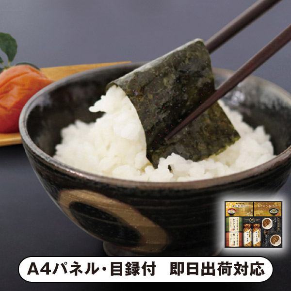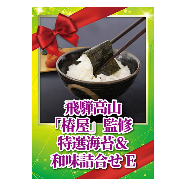 | 内容 | 飛騨高山椿屋監修(わさび海苔・梅しそ海苔)(8切6枚)・天然醸造蔵仕込み(卵かけ醤油・刺し身醤油)200ml・飛騨高山椿屋監修(根菜と鶏の和カレー・きのこと鶏の和カレー)160g×各1、黄金割烹だしパック8g・国産あごだし茶漬け5g×各2 A4パネル×1 |