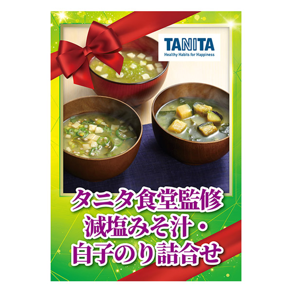 | 内容 | タニタ食堂監修減塩みそ汁(あおさ)・白子のり味のり(8切5枚)×各6、タニタ食堂監修減塩みそ汁(オクラとめかぶ・なす)×各4 A4パネル×1 |