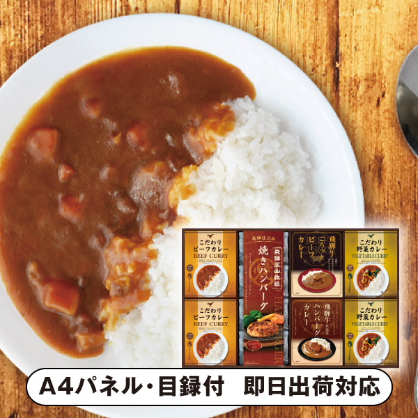 | 内容 | 焼きハンバーグ100g×4、こだわりビーフカレー180g・こだわり野菜カレー180g×各2、飛騨牛ビーフカレー190g・飛騨牛入りハンバーグカレー190g×各1 A4パネル×1 |