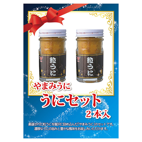 厳選された粒うにを贅沢に詰め込んだ「やまみうに」のセットです。茶粒うに40g入りの瓶が2本、濃厚なうにの旨みと豊かな風味をお楽しみいただけます。 ご飯のお供や酒の肴としてはもちろん、贈り物にも喜ばれる上質な海の幸の逸品。ご家庭で手軽に贅沢な味わいを堪能できるギフトセットです。 大切な方への贈答品やお祝いの席にぜひご利用ください。