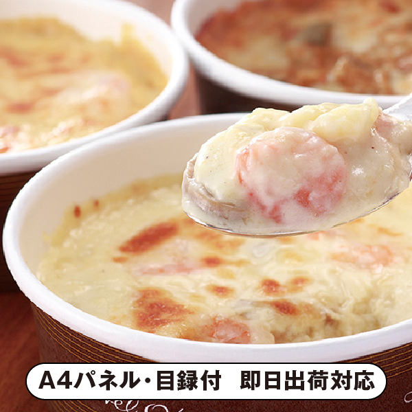 内容 | シュリンプマカロニグラタン120g・ビーフドリア135g×各2、ポテトグラタン・チキンドリア各135g×各1 A4パネル×1 |