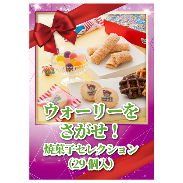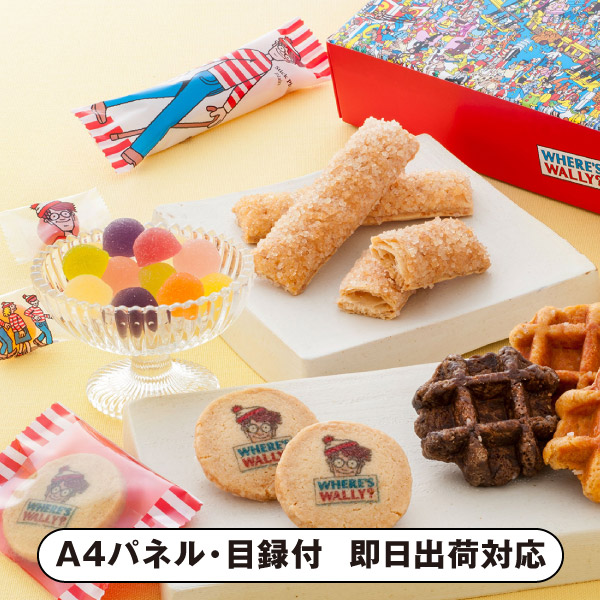 ウォーリーのオリジナルプリントクッキーと食べ応えのあるワッフル、サクッとした食感が楽しいステックパイ、色とりどりのフルーツゼリーを詰合せにしたギフトセットです。