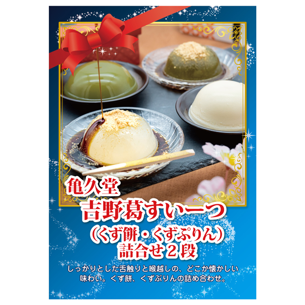 | 内容 | くず餅プレーン75g(別添黒蜜5g・きな粉5g)・くず餅抹茶75g(別添黒蜜5g・きな粉5g)・くずぷりんプレーン75g・くずぷりん抹茶75g×各2個 計8個 A4パネル×1 |