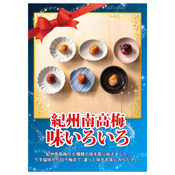 | 内容 | 松葉エキス入り梅干(塩分約14%)・うす塩味梅干(塩分約6%)・白干梅(塩分約20%)・しそ風味梅干(塩分約8%)・はちみつ入り梅干(塩分約8%)・かつお味梅(塩分約14%) 各80g A4パネル×1 |
