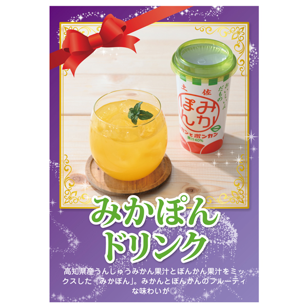 高知県産うんしゅうみかん果汁とぽんかん果汁をミックスした「みかぽん」。みかんとぽんかんのフルーティな味わいが特徴で素材の温州みかんとぽんかんは全て高知県産です。使っているお水は、高知県の水のきれいな仁淀川の伏流水を使って作られています。
