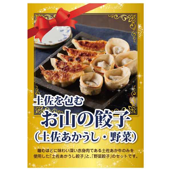 肉は程よいサシが入り、噛むほどに味わい深い赤身肉である土佐あか牛のみを使用し、独特の包み方で旨みを閉じ込めた「土佐あかうし餃子」と、自社で野菜の栽培を行い、収穫後すぐ加工する事で独特の野菜の旨みやシャキシャキ感を残した「野菜餃子」のセットです。
