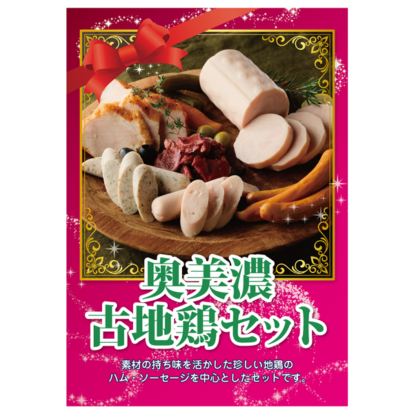 | 内容 | 奥美濃古地鶏ハム360g、奥美濃古地鶏ウィンナー150g、奥美濃古地鶏むねパストラミ150g、奥美濃古地鶏砂肝燻製60g、奥美濃古地鶏リオナソーセージチーズ80g、奥美濃古地鶏リオナソーセージレモンパセリ80g A4パネル×1 |