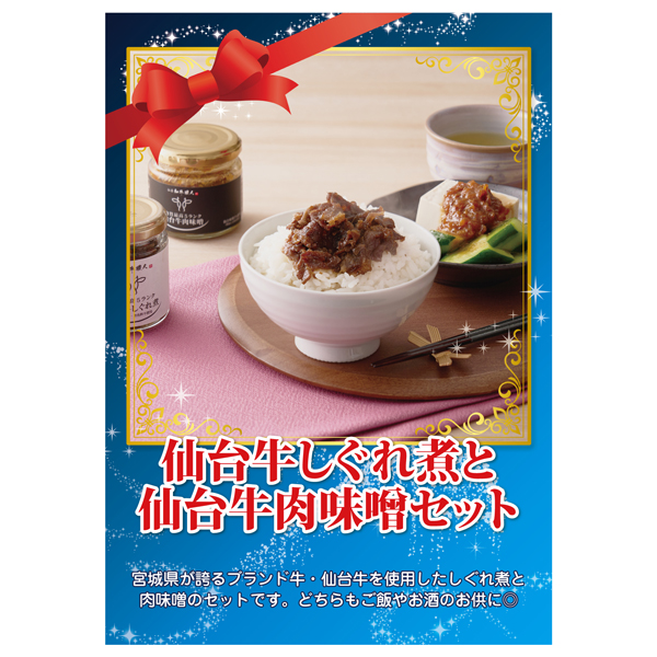 | 内容 | 仙台牛しぐれ煮60g×2本(瓶入り)、仙台牛肉味噌130g×1本(瓶入り) A4パネル×1 |
