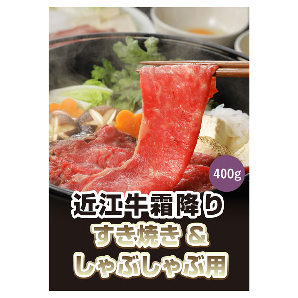 | 内容 | 近江牛霜降りすき焼き・しゃぶしゃぶ用 400g、パンフレット「解凍方法とお召し上がり方のしおり」、折箱 A3パネル×1 |