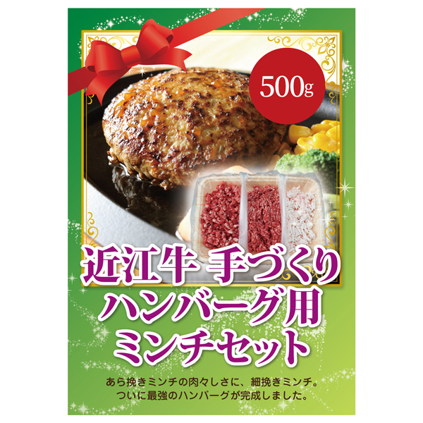 | 内容 | 近江牛手づくりハンバーグ用ミンチセット(あらびき200g・ミンチ200g・牛脂100g)、使い方リーフレット、パンフレット「解凍方法とお召し上がり方のしおり」 A4パネル×1 |