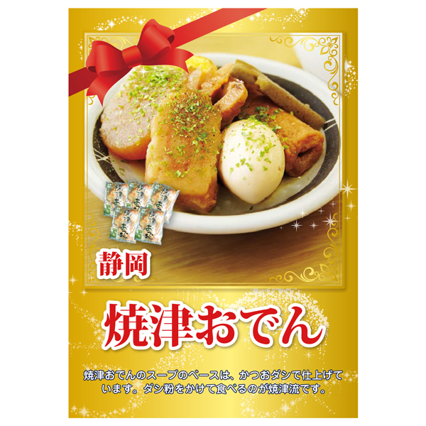 | 内容 | 焼津おでん(360g)(大根・卵・黒はんぺん・なると巻・ごぼう巻・煮込みちくわ・こんにゃく)×5、だし粉×5 A4パネル×1 |