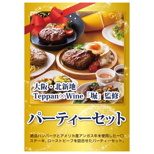 人気店の味をご家庭で 大阪の北新地に店をかまえる高級鉄板焼きのお店「Teppan×Wine堀」。この「堀」が監修した絶品ハンバーグと、赤身ブームの火付け役になった「アメリカ産アンガス牛」を使用した一口ステーキ、ローストビーフを詰合せたパーティーセットです。