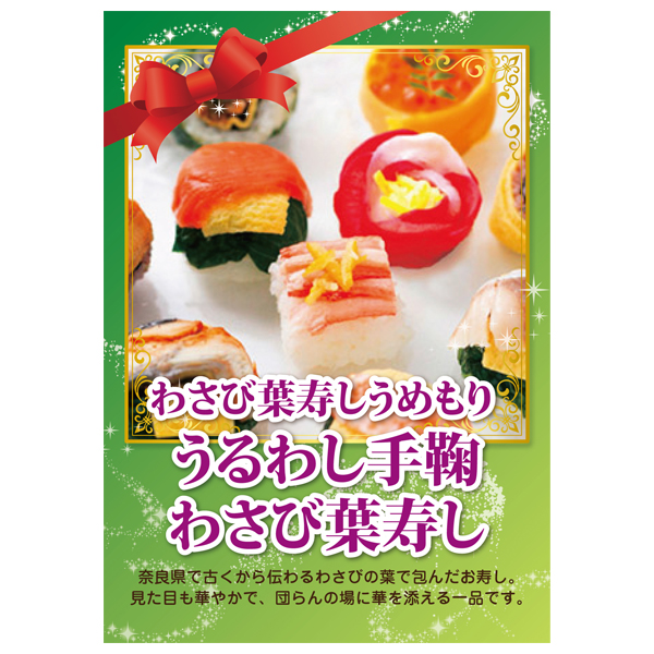 | 内容 | 手鞠わさび葉寿し(鮭・鯖・海老・鰻)・古代あなら寿し×各2、紅ずわいがに棒寿司・古代巻・紅白華手鞠・わさび巻・いくら錦糸巻×各1(560g) A4パネル×1 |