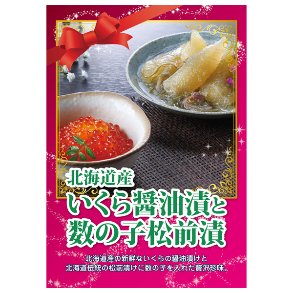 | 内容 | いくら醤油漬(100g)×1、数の子松前漬(120g)×2 A4パネル×1  |