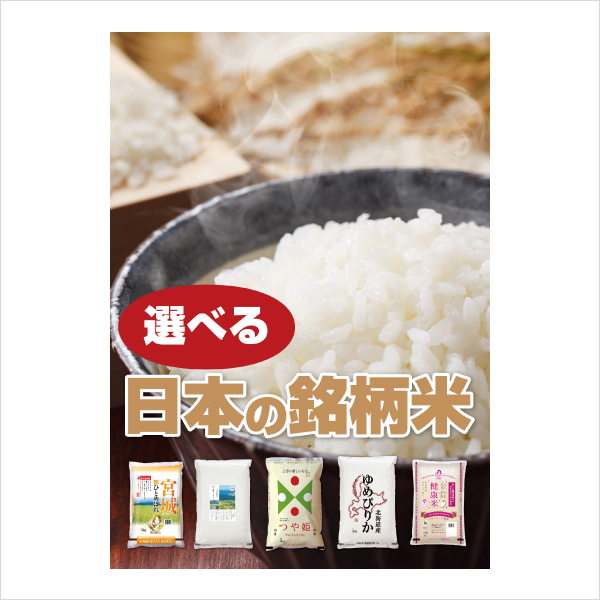 | 内容 | 次の中からお選びいただけます。 【山形県】特別栽培米 つや姫 【熊本県】森のくまさん 【北海道】雪蔵仕込 ゆめぴりか 【宮城県】ひとめぼれ 【秋田県】金賞健康米 あきたこまち 【新潟県】雪蔵仕込 コシヒカリ 【新潟県】雪蔵仕込 こしいぶき A3パネル×1 |