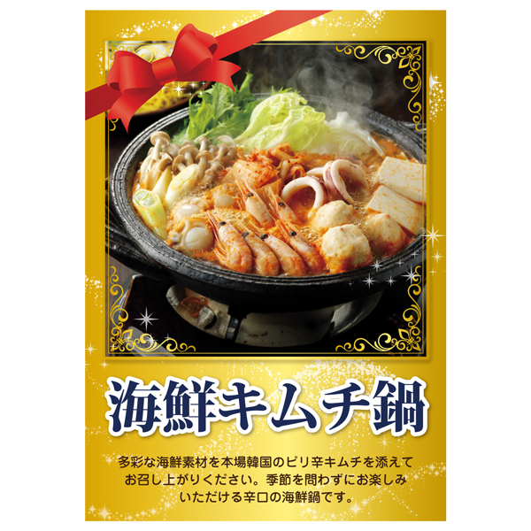 多彩な海鮮素材を本場韓国のピリ辛キムチを添えてお召し上がりください。季節を問わずにお楽しみいただける辛口の海鮮鍋です。