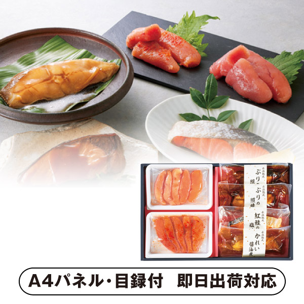| 内容 | 辛子明太子(150g)・あごだしうまみたらこ(150g)・かれい醤油煮(100g)・紅鮭塩焼き(60g)×各1、ぶりの照焼き(90g)×2 A4パネル×1 |
