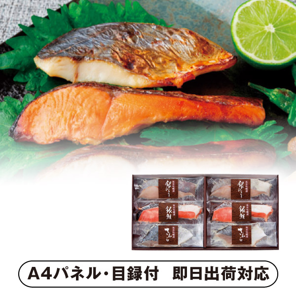 | 内容 | 銀鮭西京吟醸漬(70g)・さわら西京吟醸漬(70g)・銀ひらす西京吟醸漬(70g)×各2 A4パネル×1 |