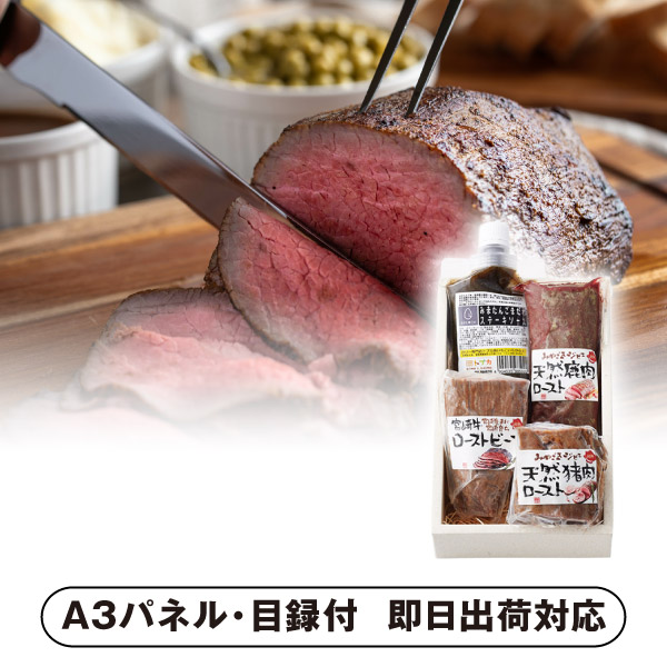 | 内容 | 天然鹿肉ロースト(200g)・天然猪肉ロースト(200g)・宮崎牛ローストビーフ(200g)・ゴマソース(150g)×各1 A3パネル×1 |