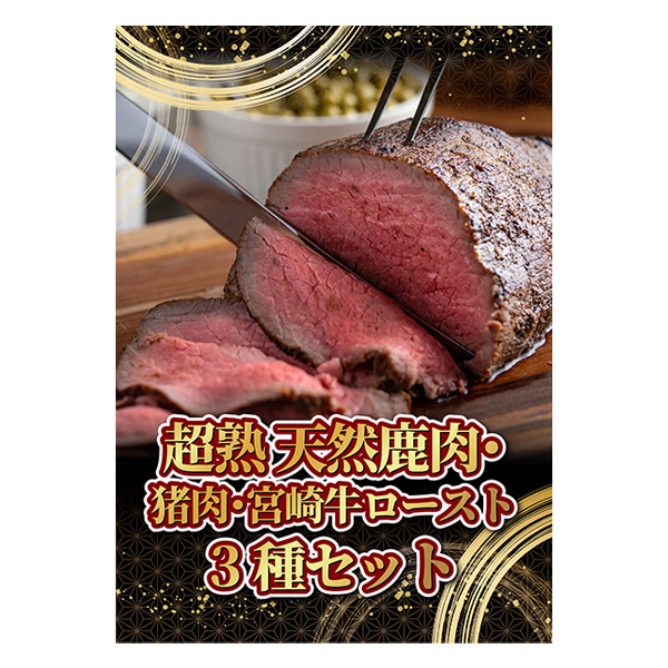鹿肉・猪肉・宮崎牛を贅沢に味わえる3種のローストセット。熟成によって引き出された深い旨みと豊かな香りが楽しめ、食卓に特別な時間をもたらします。贅沢な食べ比べができるギフトとして、大切な方への贈り物に最適です。