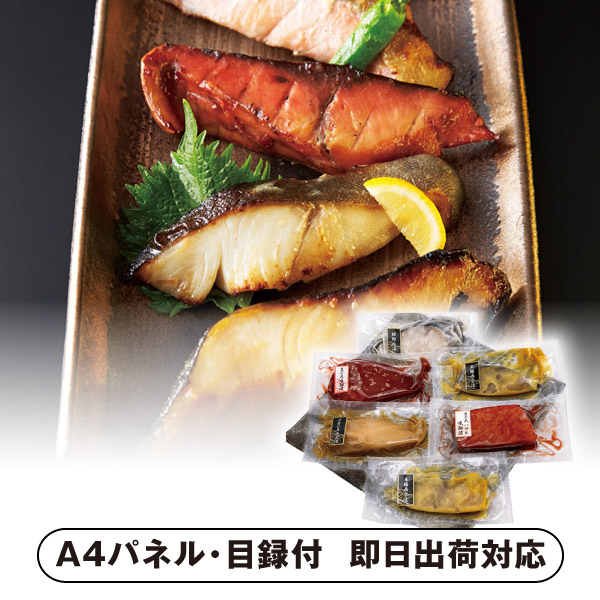 | 内容 | 本鰆西京漬(80g)×2、銀だら粕漬け(80g)・カジキみそ漬(80g)・まぐろみりん漬(80g)・まぐろハラモみりん漬(80g)×各1 A4パネル×1 |