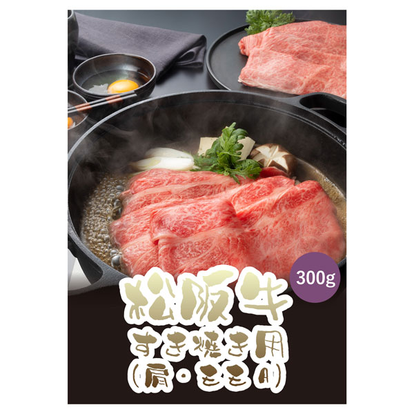 | 内容 | 松阪牛 すき焼き用(肩・モモA)300g、牛脂、パンフレット「美味しいお肉の召し上がり方」、松阪牛個体識別番号付き A3パネル×1 |