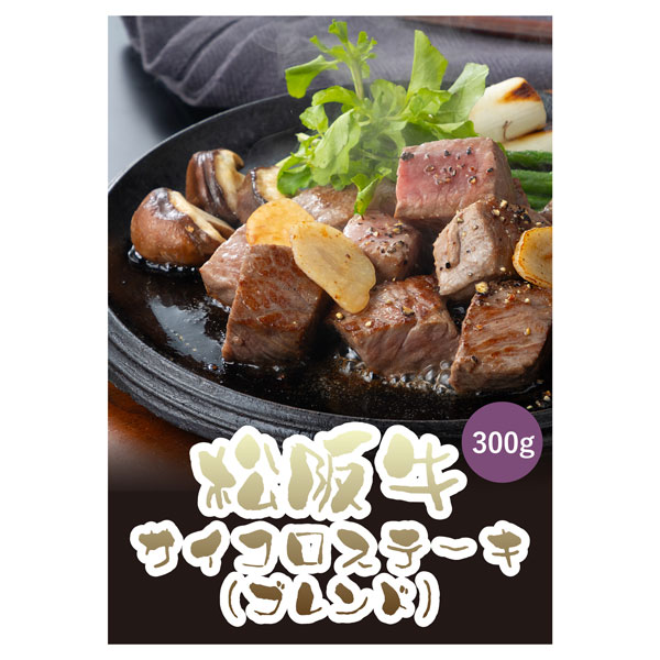 | 内容 | 松阪牛 サイコロステーキ(ブレンド)300g、ステーキ調味料、牛脂、パンフレット「美味しいお肉の召し上がり方」付き A3パネル×1 |