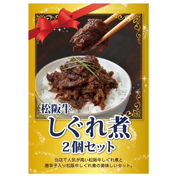 | 内容 | 松阪牛 しぐれ煮60g×1、松阪牛 しぐれ煮 唐辛子入り60g×1 A4パネル×1 |