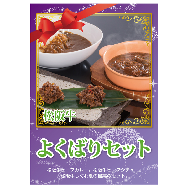 | 内容 | 松阪牛 しぐれ煮60g、松阪牛 しぐれ煮 唐辛子入り60g、松阪牛ビーフカレー200g、松阪牛ビーフシチュー200g A4パネル×1 |