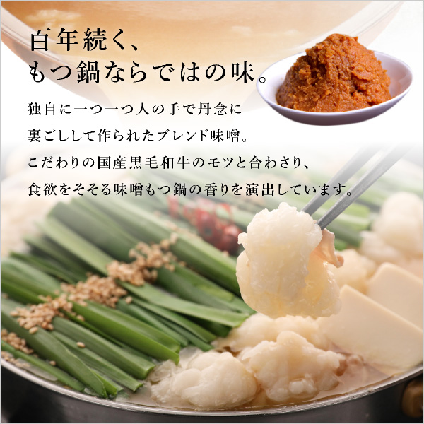 1番人気のもつ鍋味噌味。独自のブレンド味噌を使用しており、近年のもつ鍋の主流。白味噌仕立ての上品な味と、口の中で肉厚な牛もつがとろける絶妙な味わいが魅力的です。
