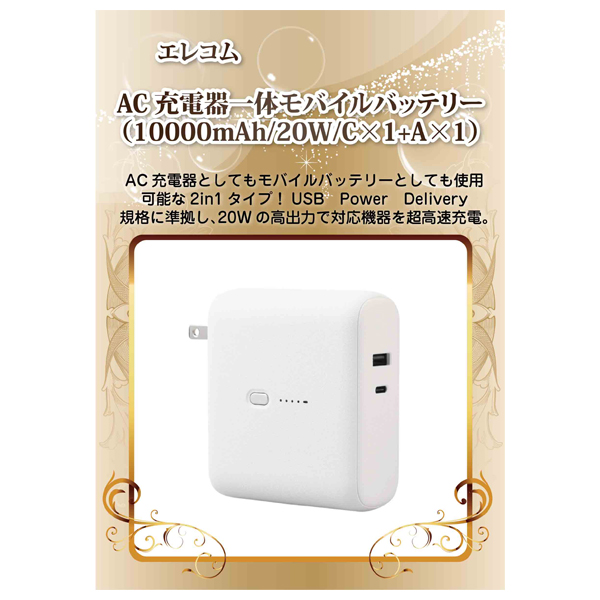 エレコム AC充電器一体モバイルバッテリー(10000mAh/20W/C×1+A×1)【パネル・目録付】|景品ならPIARY(ピアリー)