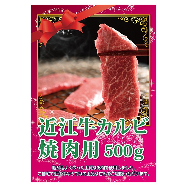 | 内容 | 近江牛カルビ焼肉用 500g(トレーに入っています)、パンフレット「解凍方法とお召し上がり方のしおり」 A4パネル×1 |