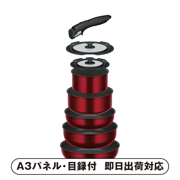 | 内容 | フライパン22cm(約235×235×60mm)・フライパン26cm(約275×275×65mm)・炒め鍋24cm(約3.4l)(約255×255×80mm)・鍋16cm(約1.8l)(約175×175×85mm)・鍋20cm(約2.7l)(約215×215×85mm)・取っ手・フタ16cm・フタ20cm×各1 A3パネル×1 |