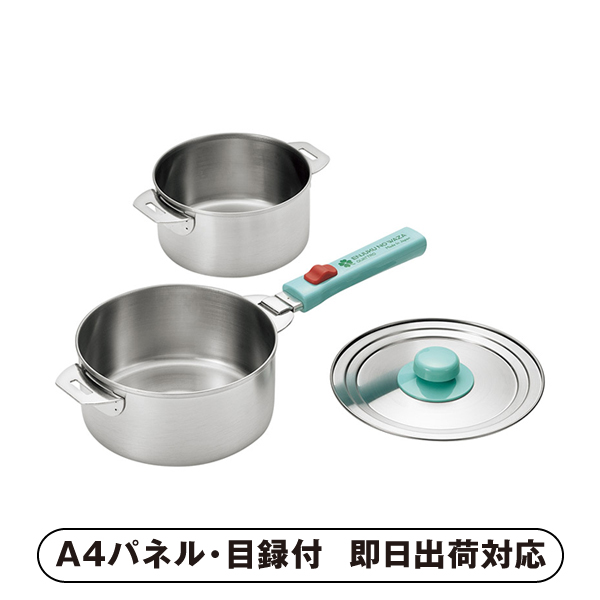 | 内容 | 鍋14cm(約1.1l)(約145×195×73mm)・鍋16cm(約1.6l)(約165×215×78mm)・兼用蓋・着脱ハンドル×各1 A4パネル×1 |