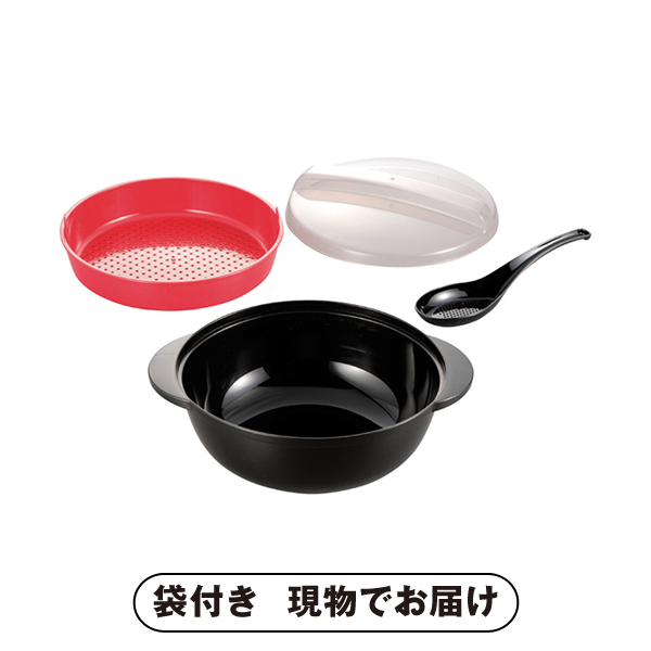 即席めんをレンジで調理!! 鍋もコンロも不要!!そのまま器として使える調理鍋。目皿付なので野菜も一緒にチン出来ちゃいます!!かんたんレシピ付。