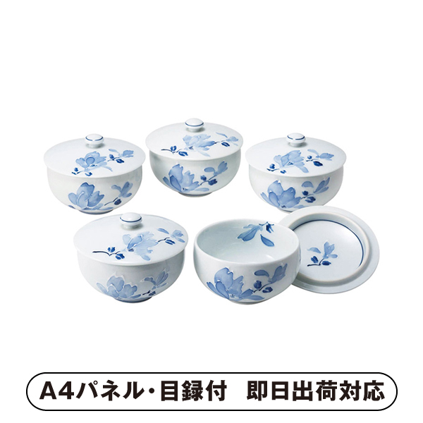 白い湯呑に描かれた淡い青の花が美しい茶器のセットです。高級感と上品さがあり、大切なお客様をおもてなしするときにぴったり。外側だけでなく、蓋の裏や湯呑の内側にも花が描かれていて華やかなアイテムです。