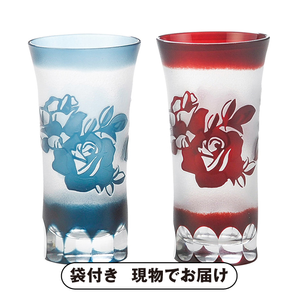 バラの柄が印象的な青と赤の切子です。特別なお祝いやおもてなしにも使えて日常使いもできる、これ1つで食卓がパッと華やかになるアイテム。お酒好きな方へ贈るちょっとしたプレゼントにもおすすめです。