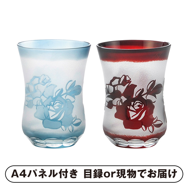 バラの柄が印象的な青と赤の切子です。特別なお祝いやおもてなしにも使えて日常使いもできる、これ1つで食卓がパッと華やかになるアイテム。お酒好きな方へ贈るちょっとしたプレゼントにもおすすめです。