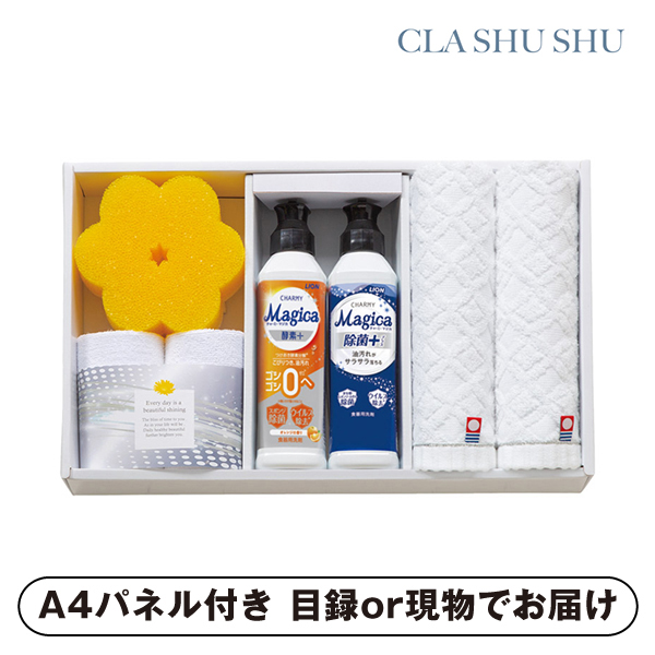 チャーミーマジカオレンジと除菌プラスの洗剤に、タオルやクロス、スポンジを加えた、使いやすいキッチンギフト。毎日の家事を快適に彩ります。贈って喜ばれるキッチン洗剤としておすすめです。