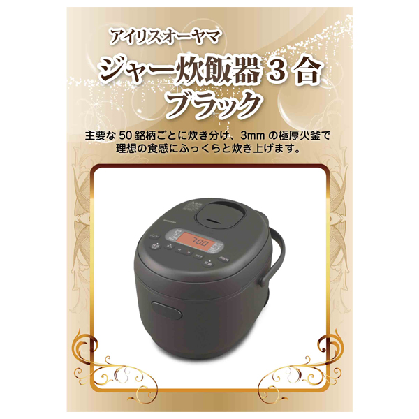 アイリスオーヤマ ジャー炊飯器 3合 ブラック【パネル・目録付】|景品ならPIARY(ピアリー)