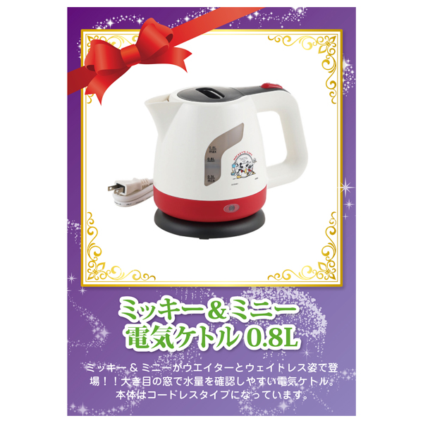ミッキー&ミニーがウエイターとウェイトレス姿で登場!!大き目の窓で水量を確認しやすい電気ケトル。本体はコードレスタイプなのでお湯を注ぐ際にコードが絡みません。