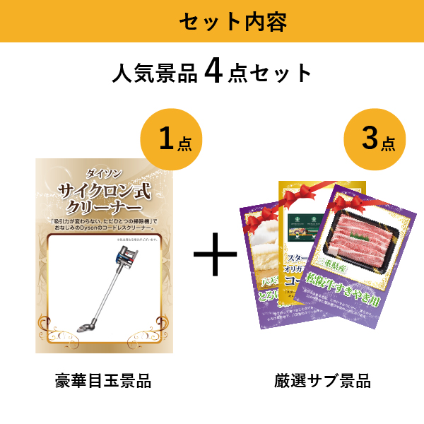 「ダイソン サイクロン式クリーナー」をメイン景品とした、メイン景品1点とサブ景品3点を合わせたセット!