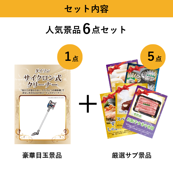 「ダイソン サイクロン式クリーナー」をメイン景品とした、メイン景品1点とサブ景品5点を合わせたセット!