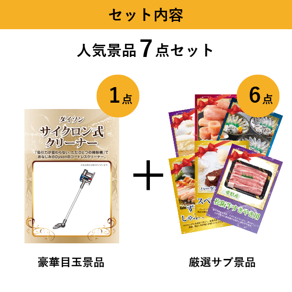 「ダイソン サイクロン式クリーナー」をメイン景品とした、メイン景品1点とサブ景品6点を合わせたセット!
