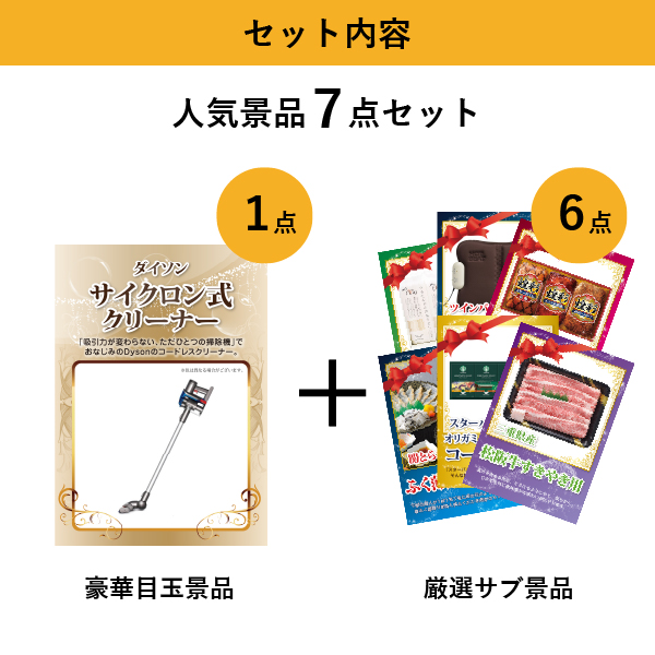 「ダイソン サイクロン式クリーナー」をメイン景品とした、メイン景品1点とサブ景品6点を合わせたセット!