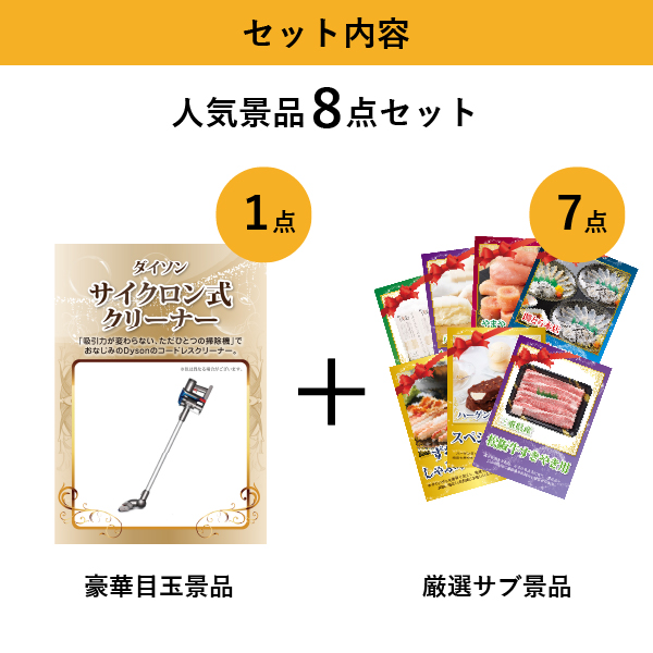 「ダイソン サイクロン式クリーナー」をメイン景品とした、メイン景品1点とサブ景品7点を合わせたセット!