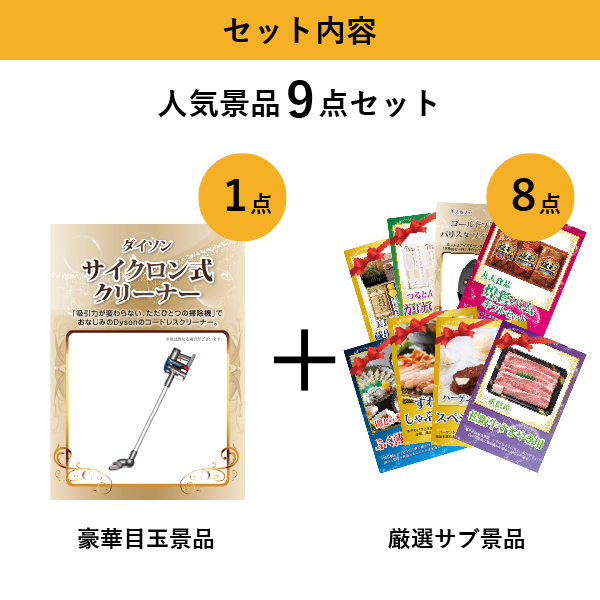 「ダイソン サイクロン式クリーナー」をメイン景品とした、メイン景品1点とサブ景品8点を合わせたセット!