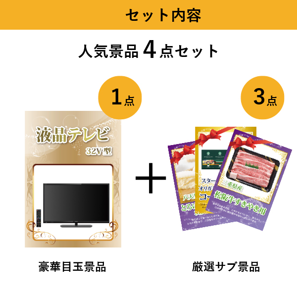 「32型液晶テレビ」をメイン景品とした、メイン景品1点とサブ景品3点を合わせたセット!